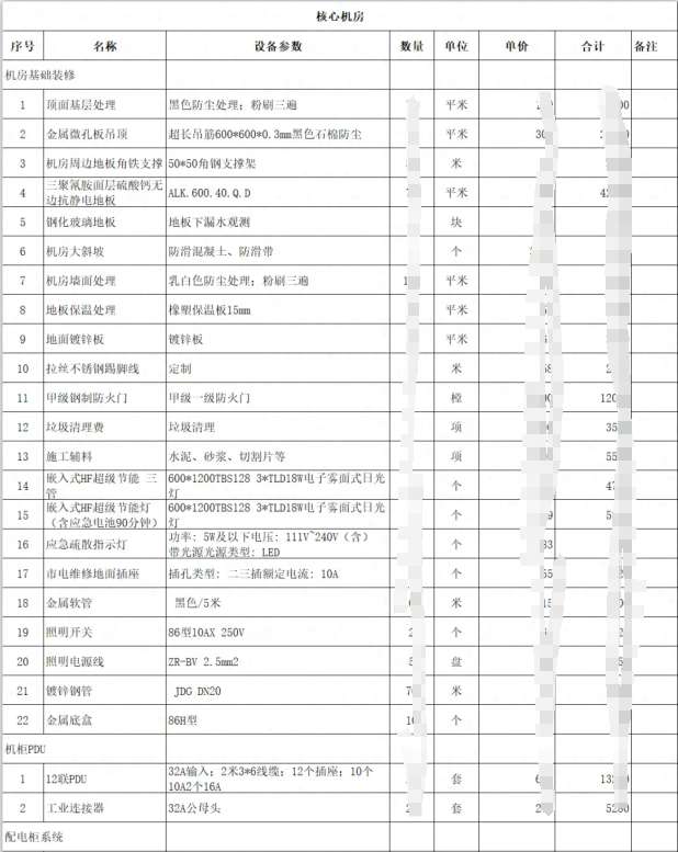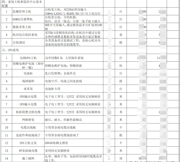 機房建設是一個綜合性的工程,?涉及到多個系統的設計和安裝,?包括配電系統、?照明系統、?防雷接地系統、?空調通風系統、?安全監控系統等。?以下是一個機房建設的清單明細表,?詳細列出了機房建設清單所需的主要設備和材料:?